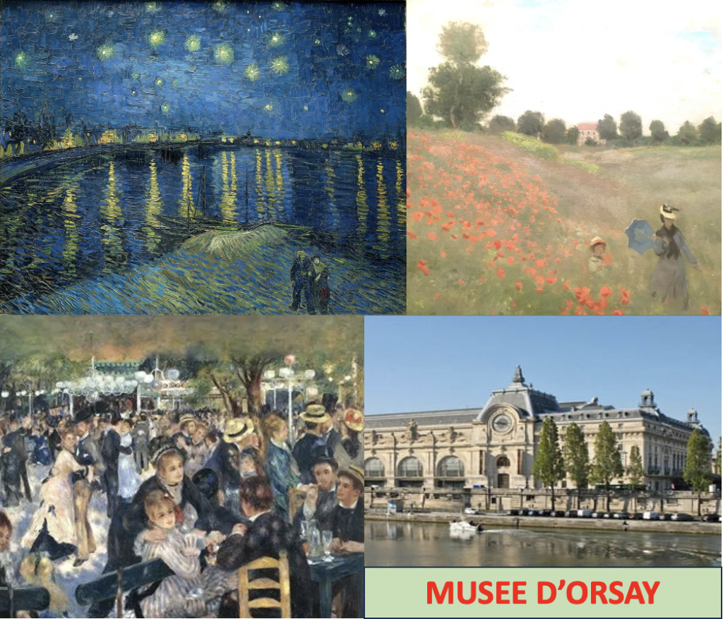 - D’ORSAY: former train station, exhibiting artifacts from 1848 to WWI, including realistic painters, the Impressionist, Post-Impressionist and Neo-Impressionist painters, and Art nouveau
